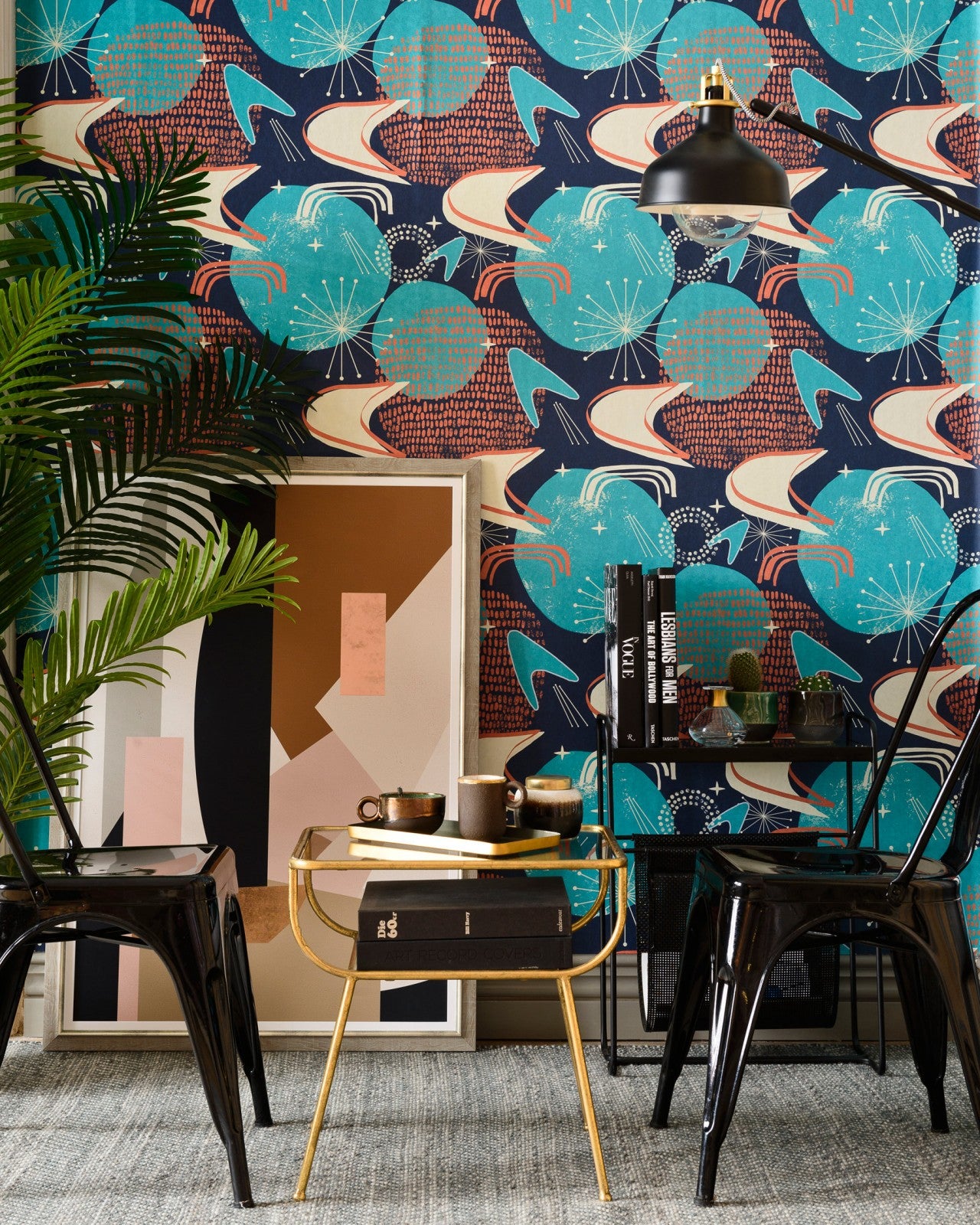 A rich coloured modern style illustration created in the Mid-Century Modern manner depicting an imaginary cosmic view. The large scale shapes combined with the specific dots creates a contemporary pattern but yet reminding of the abstract style of the 60s.