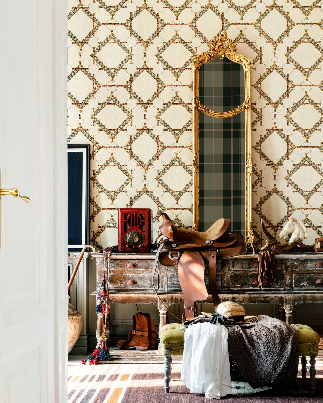 Embrace minimalism with a spirited equine twist in the subtle pattern of DECORATIVE HARNESS, which forms a belted, buckled grid with chic leather straps and elegant metal rings. Melded with squares of a quietly patterned turquiose print edged in gilded leaves, the overall effect is one of simple geometry – it’s only when studied up close that the intricacies of each element become apparent. Available in three textured colours to suit contrasting moods, try the black base for impact and to emphasize the fine details, rich red for a cocooning, comforting feel, or the pale, off- tone for a subtle finish.
