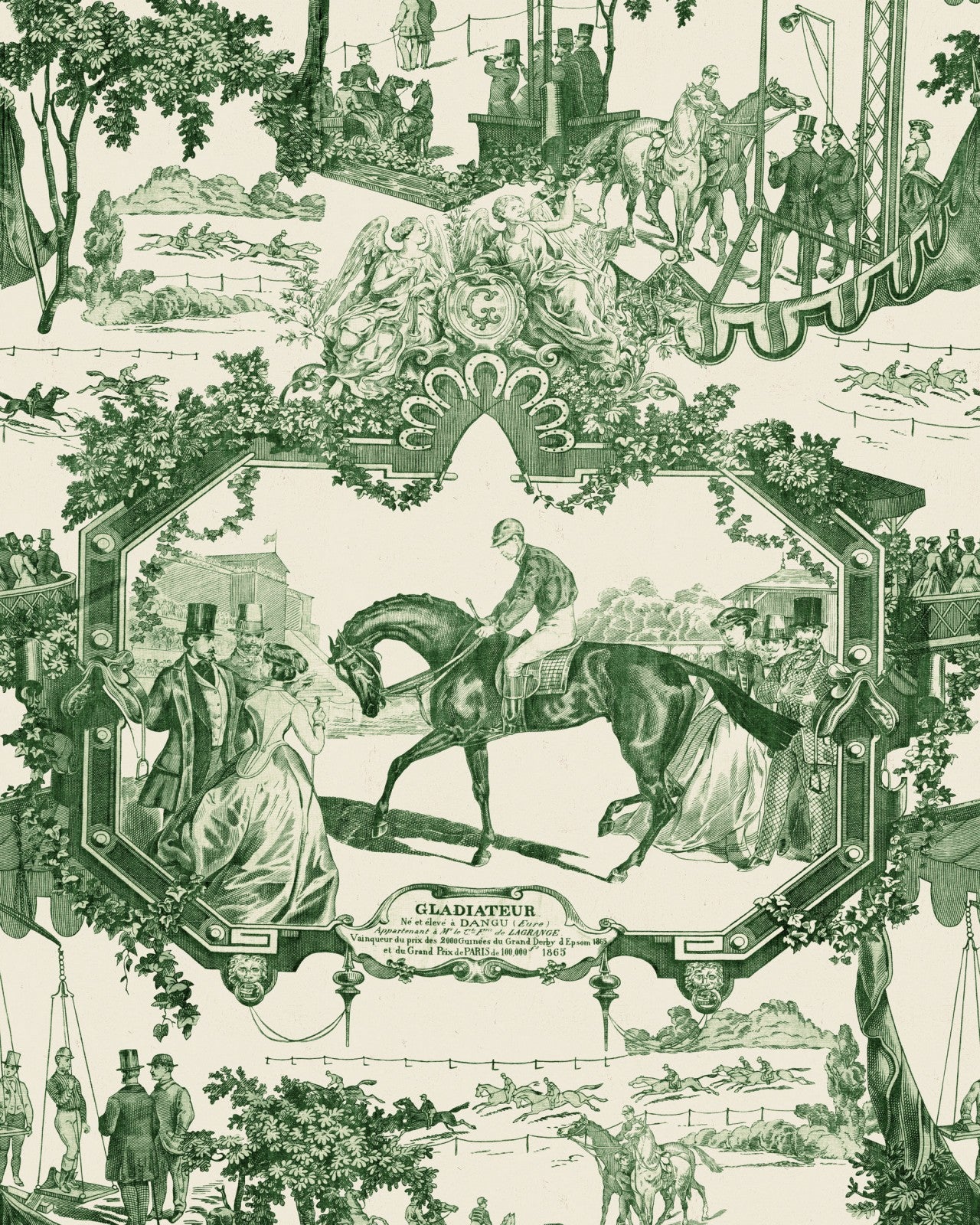 Saddle up for the race of your life with the GRAND PRIX, a wallpaper drawing influence from French Toile de Jouy pattern with a sporty, equine twist. Don your jewels and finery head to the racecourse – join the spirited crowd, converse with the jockey, find a lucky horse shoe, or place a bet or two in this lively illustrative print, where the hand drawn merges true to life realism with a satirical, cartoon-esque character. Printed in a single colour, choose from either a soft green which heightens the leafy, rural setting or rich red on a warm backdrop for a taste of traditional English country life.