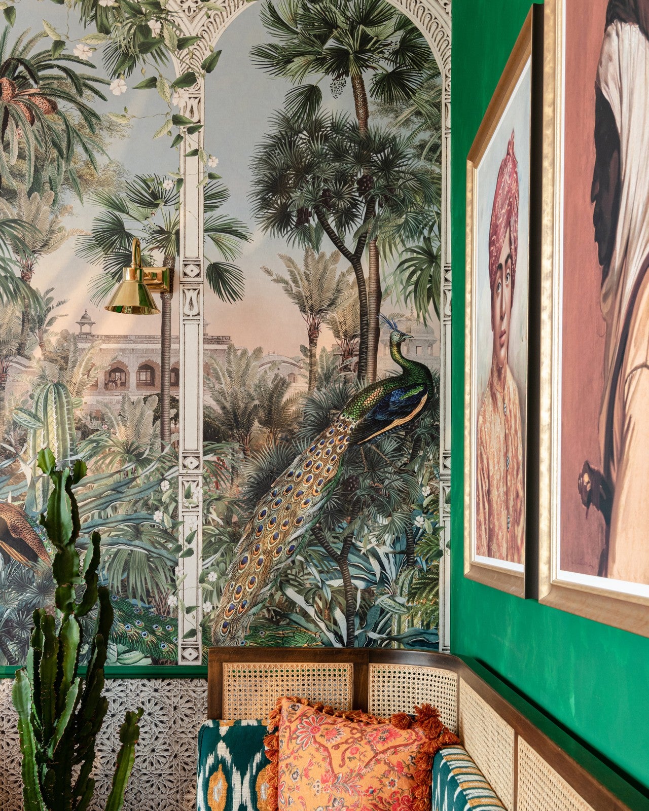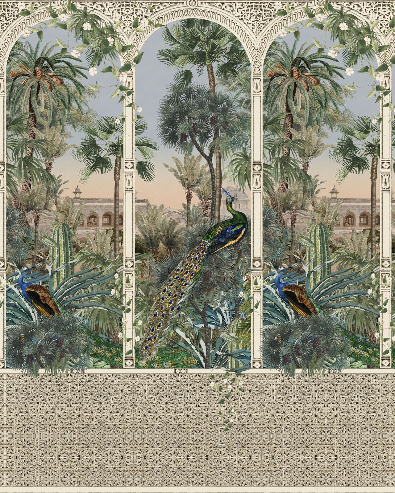 Transport yourself to the inner walls of a sprawling riad, looking out onto mesmerising gardens, where palms stand tall, and peacocks proudly strut through indigenous shrubs, beautifully captured through the ornate arches of the outer walls. Named after the Oasis town within the Sahara Desert, this luscious garden scene offers a welcome contrast to the surrounding barren landscape while the floral structure of the wall blends architecture and nature into one. The pastel pink and blue hues of the sky carry a magic to the ERFOUD print, instigating a wanderlust which brings a warmth and joy to the home.