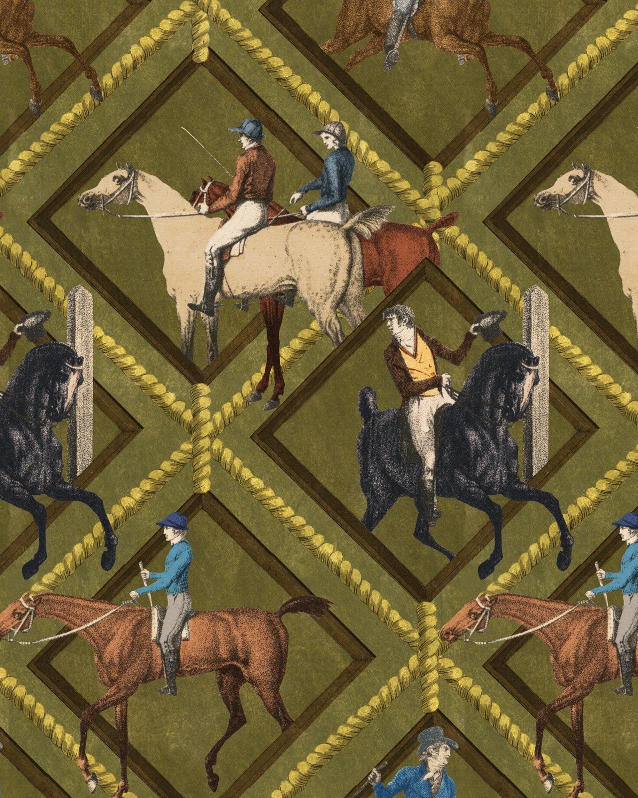 Saddle up and show off your skills in GYMKHANA, a pattern embodying the good-natured competition, dedication and showmanship of the equine world. Only the fastest most spirited of beasts partake in this contest exhibiting their perfect forms by trotting, galloping, cantering and jumping between their diamond-shaped enclosures, while riders are straight backed, perfectly poised and raring to race. The black diamond shape of the horse’s pens and surrounding lines of twisted rope give this wallpaper a structural, geometric feel, which is broken up by the playfully prancing ponies – choose from a warm green tinted hue, or a more faded grey shade.