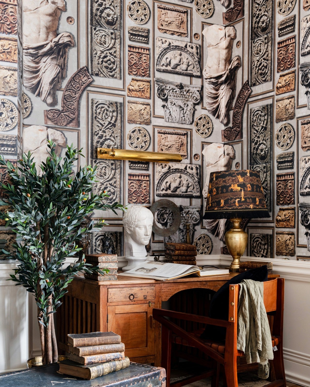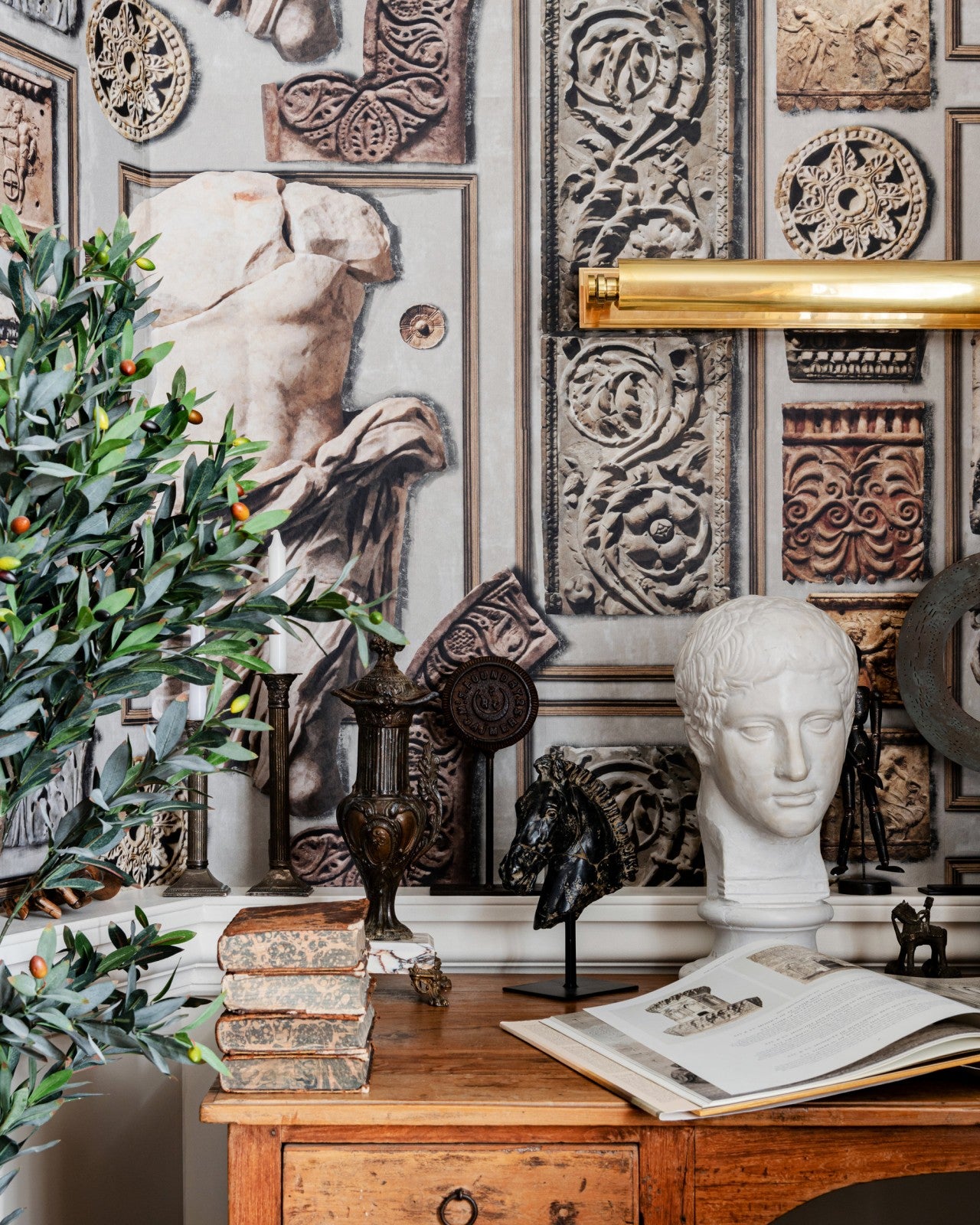 Are you walking your own halls, or admiring the riches of a lofty museum? The wonders of Ancient Rome have been collected and put on display for your viewing pleasure, there’s no need to leave the house. Wonder at the detailing of fabric-wrapped statues, climb to the top of decorative columns and run with the chariots in intricate carved reliefs, with only the finest pieces brought to your attention. RARE ARTIFACTS creates a cabinet of curiosities worthy of the most audacious emperor. The design is printed over 3 panels.