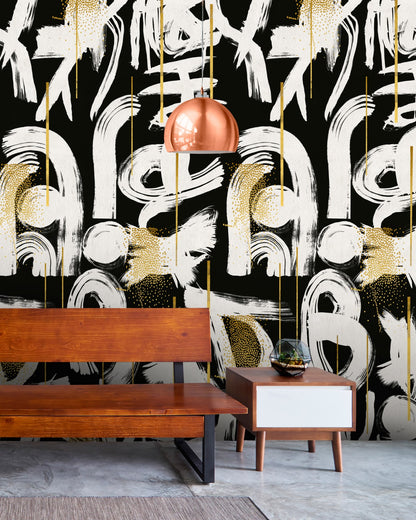 A truly abstract masterpiece, on a black background, with an energetic palette of bold brush-like strokes. Golden, thin lines tie the entire GESTURAL ABSTRACTION premium wallpaper together, in an elegant and bold design. Use it in various places, as the right furniture and home accessories can turn the vibes from minimalist to sophisticated and from to ethereal to cozy.