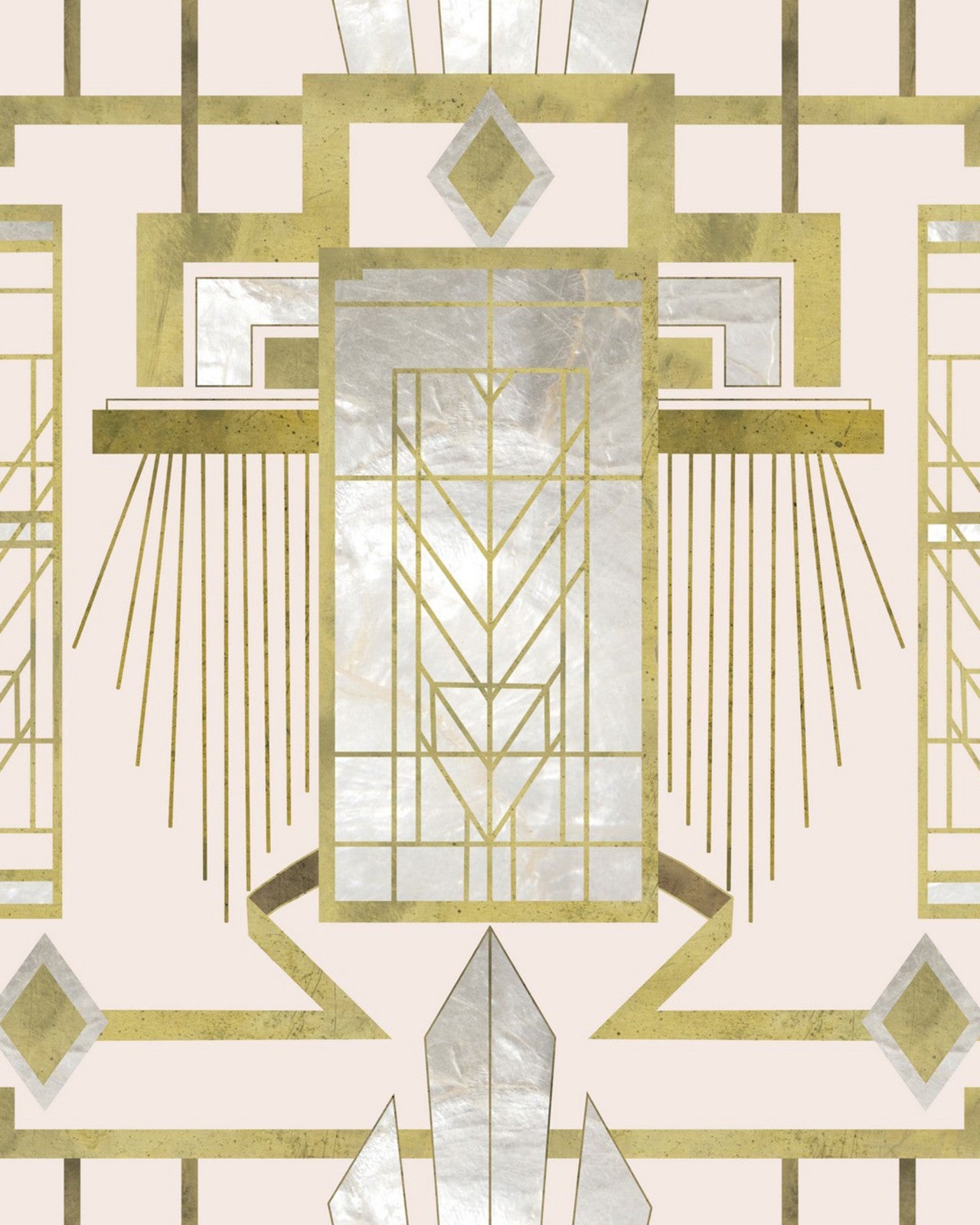 A glamorous piece, featuring bold geometric shapes, metallic accents and pale pink shades.