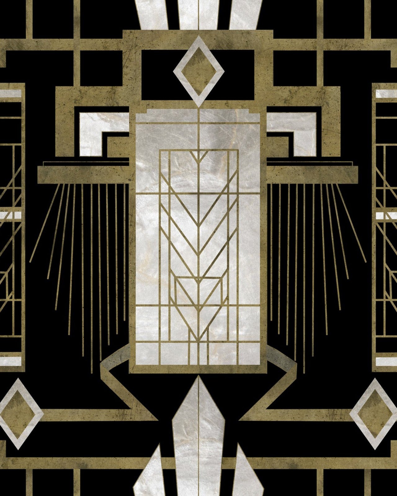 A glamorous piece, featuring bold geometric shapes, metallic accents and dark shades.