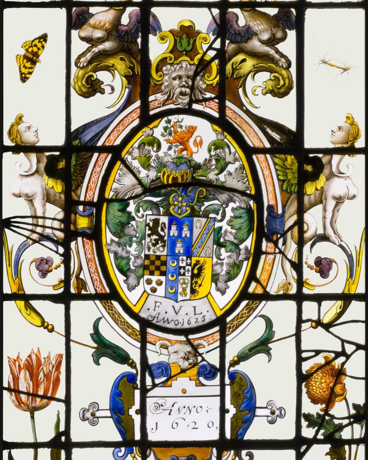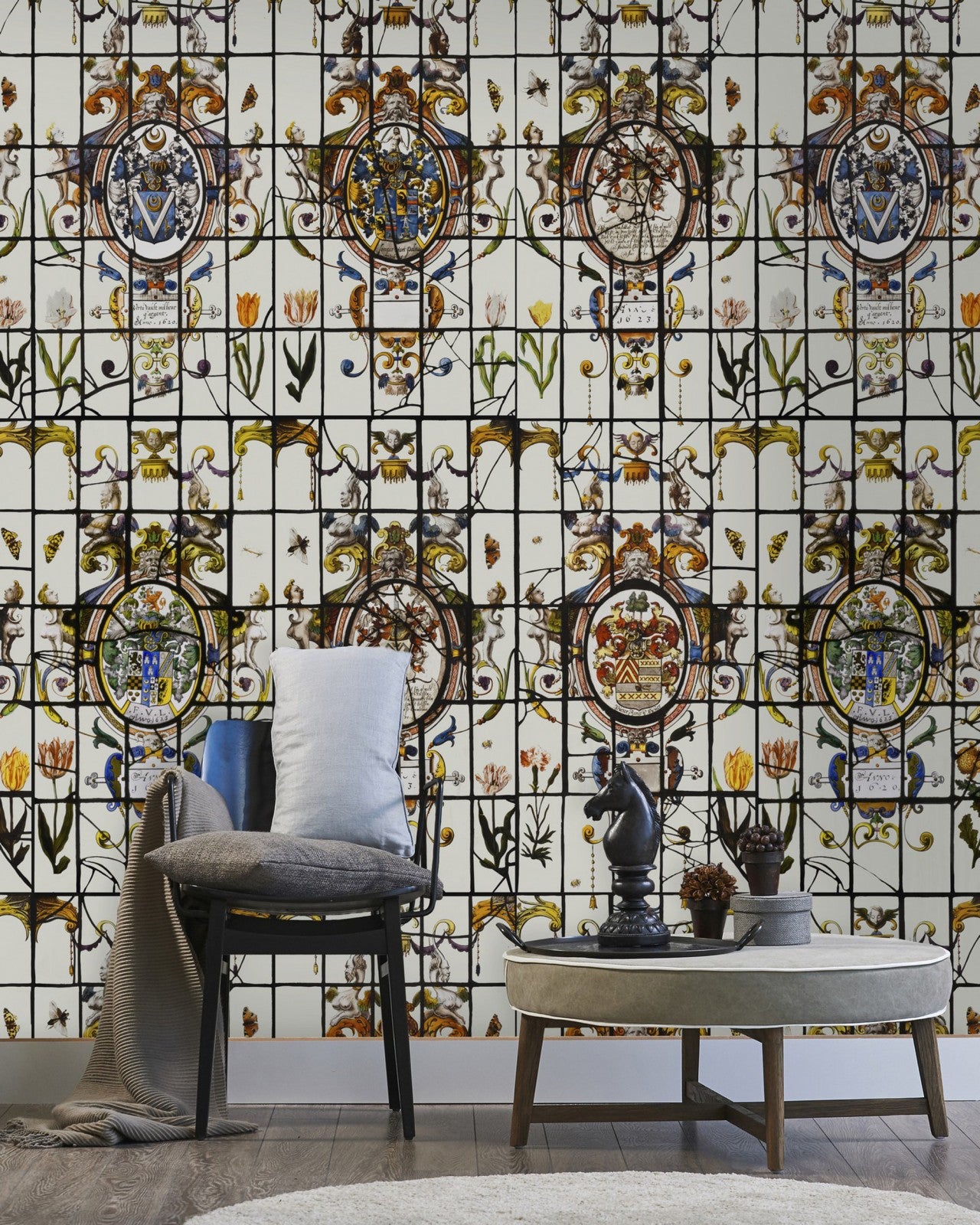 An outstanding wallpaper, inspired by a stained heraldic window of a Dutch church. The design is printed over 3 rolls.