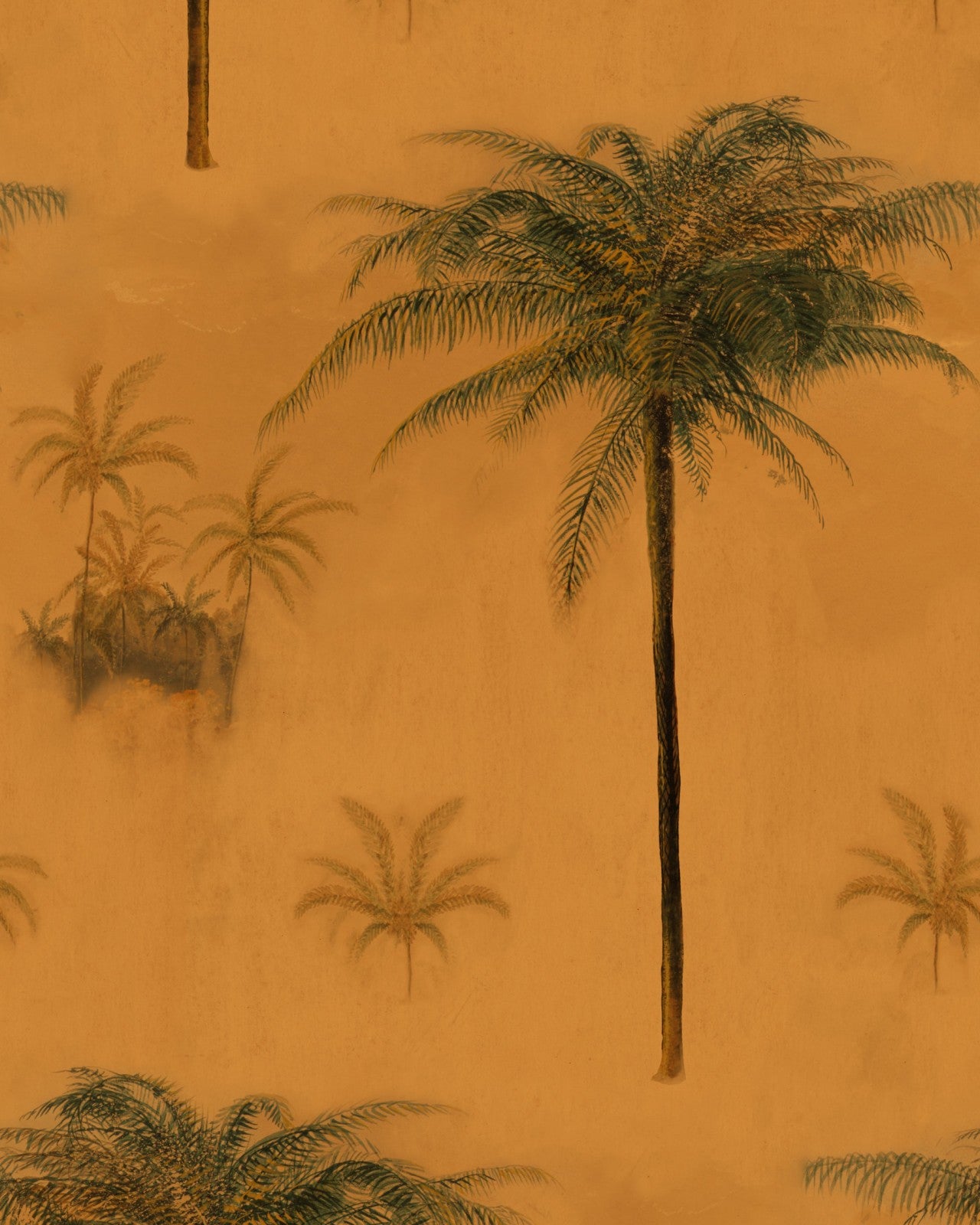Dark contours of palm stems blend with pastel greens and sandy shades of gold, in a hazy, calming composition. Retracing the long, sandy beaches of the tranquil islands of the Caribbean, the pattern of this premium wallpaper is both soothing and charming.