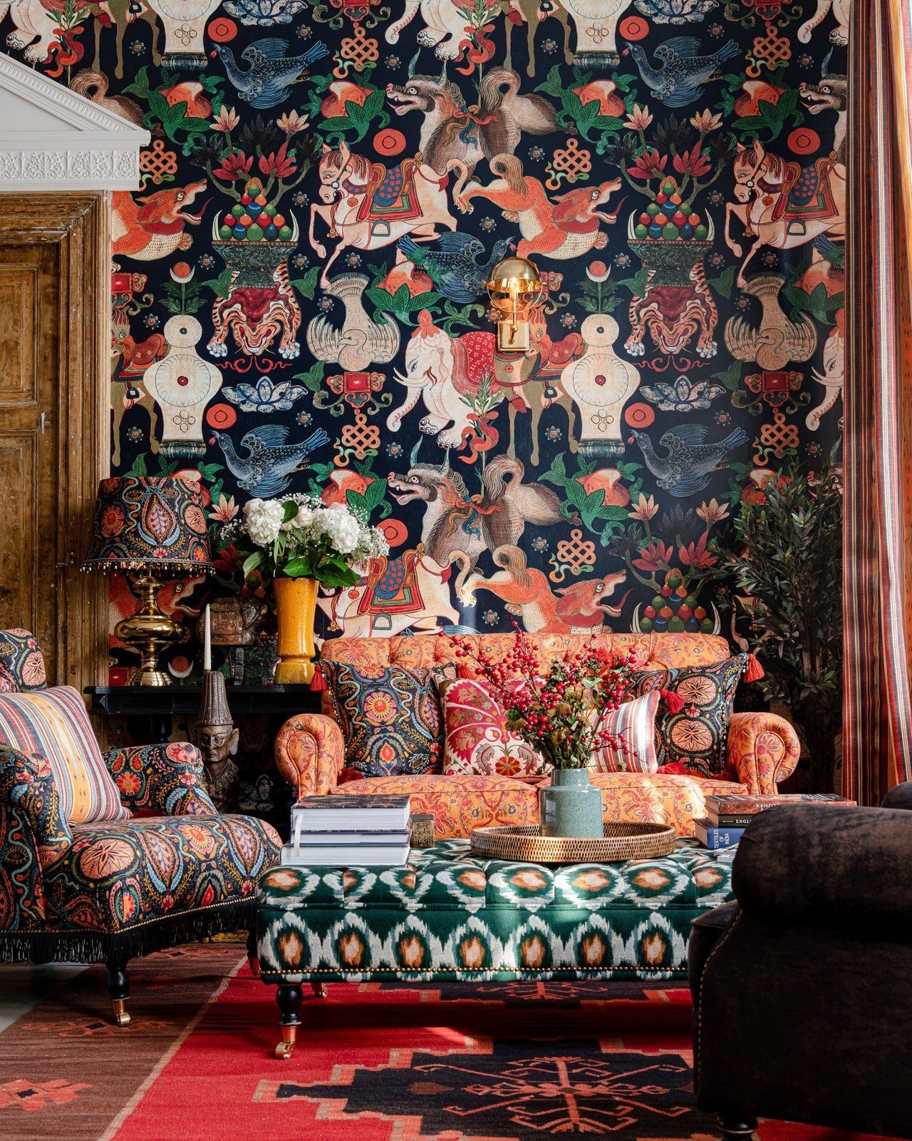 Expect the unexpected in the mystical world of INCANTATION. Where creatures roam freely through an enchanted setting, stay alert as you never know what lies around the corner. Exotic birdlife, ornamented horses and mythical dragon-like animals will surround you, as you wander through gardens filled with striking florae and intricate architectural figures. With backdrops of cream, dark blue and yellow, this vivacious print opens your senses as you imagine a rich, aromatic scent flowing through the air in this fascinating and captivating domain.