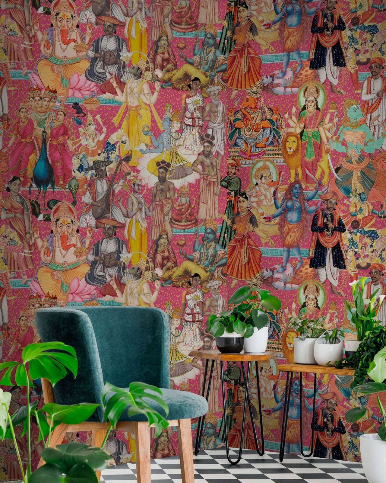 A surprising collage in a pop art style, inspired from the Hindu Gods and Goddesses. This unique wallpaper is visually appealing in every environment. The design is printed over 3 rolls.
