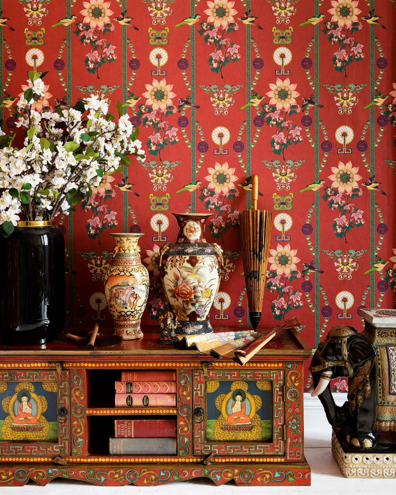 Revive any space with this beaming floweret wallpaper design. Inspired by one of the famous Chinese gardens, LIN YUAN wallpaper elegantly displays auspicious plants, birds and plum blossoms in a gracious entwine. Authentic Oriental motifs and symbols of luck, wealth and immortality, peak behind the gates of heavenly pattern, creating a lavish, bountiful atmosphere. Also available against a red background.