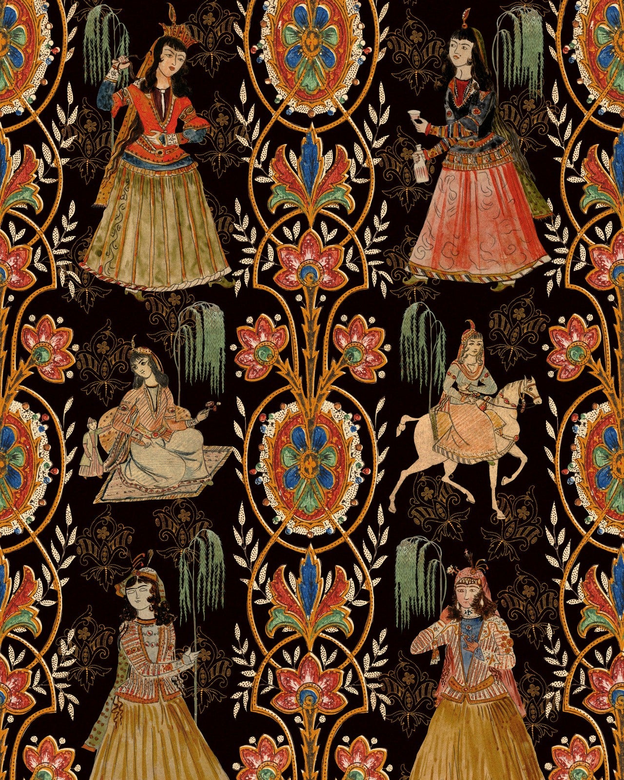 Featuring local women in traditional dress against an intense, black background, the entrancing MAGHREBIAN FOLKTALE print is brought to life, adding a pop of colour to the home. Placed around striking, colourful floral motifs the beauty of Maghrebian fashion is celebrated from ornamental headwear to luxurious, flowing garments. Transport the magic of the region to your home directly with this bold and vivacious wallpaper.